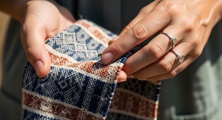 A close-up shot of a person's hands holding a piece of a traditionally woven, patterned textile in a mix of brown, white, and blue. The focus is on the intricate pattern and texture of the fabric, celebrating craftsmanship and cultural art.