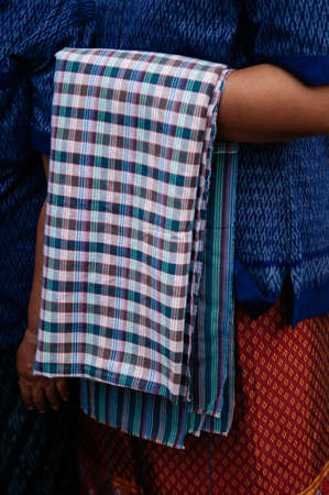 Asain woman holding Pha Khao Ma, Thai traditional multi-purpose loincloth with scottish pattern colourful fabric.