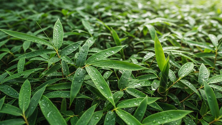Gentle showing lush green bamboo leaves covered in fresh water droplets after a gentle rain shower keywords: bamboo, leaves, green, nature, plant,...