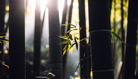 Sunbeams gently filtering through vibrant green bamboo leaves, creating a peaceful and tranquil atmosphere in a forest