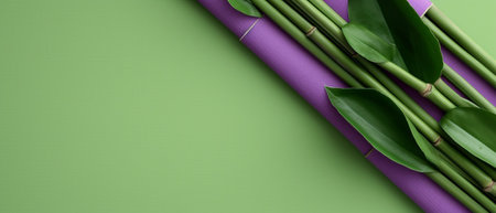 Generative AI : Green bamboo leaf wooden background Top view Copy space
