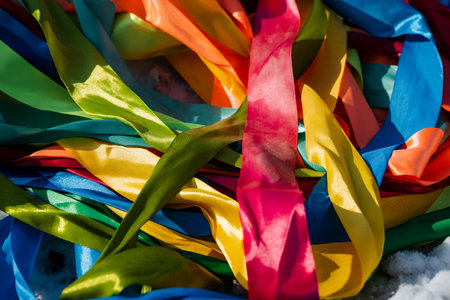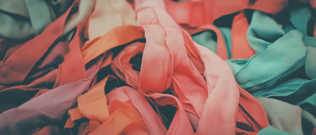 Ribbons showing scattered colorful satin ribbons in a vibrant chaotic arrangement forming an abstract background....