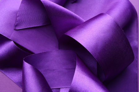 Beautiful violet ribbons on color background, closeup