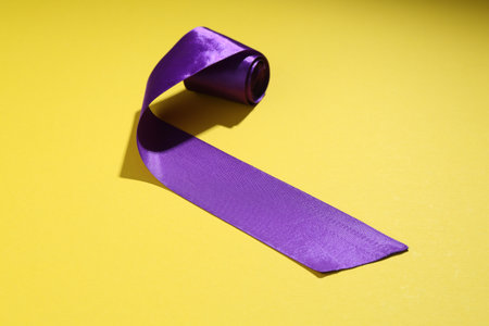 One beautiful violet ribbon on yellow background