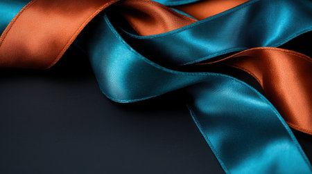 A stunning close-up of teal and orange satin ribbons gracefully intertwined on a dark surface. Perfect for decoration, crafting, or styling.