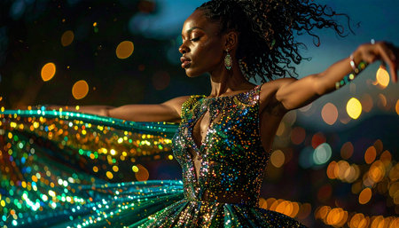 Stylish young African American in green dress, gold earrings at festive event, disco balls, enhancing celebratory mood, party atmosphere, dance floor vibe, fashion style, glamourous attire