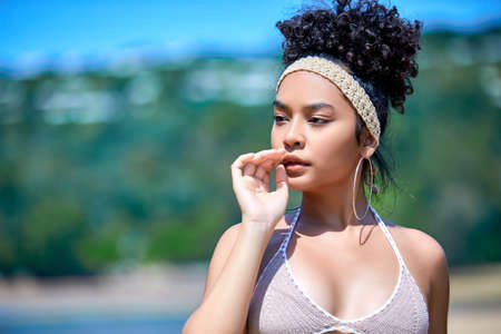 Portrait of a beautiful young woman with curly hair on the beach
