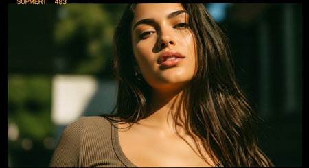A young woman with wavy hair stands against a textured wall showcasing a confident expression. The warm light highlights her features capturing the essence of urban beauty at sunset.