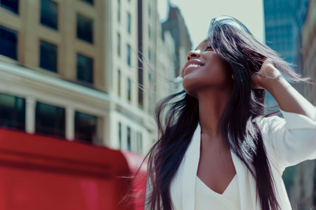 Young black businesswoman enjoying the wind in her hair in a big city center