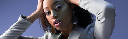 panoramic shot of attractive african american woman looking at camera isolated on purple