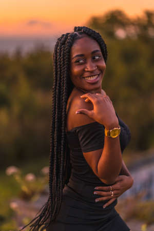 Lifestyle, Latina girl with black skin with beautiful long braids in her hair, wearing a tight black short dress. Portrait of the young man on top of the mountain in a beautiful summer sunset
