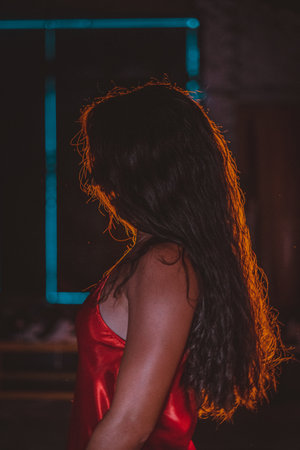 A shallow focus of a female with long brown hair wearing a red dress under the lights in a dark room