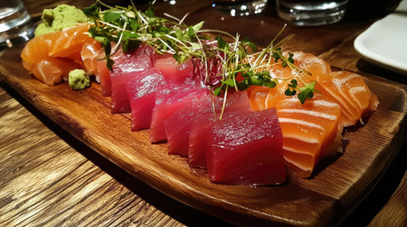 Freshly Sliced Raw Fish Sashimi. Sliced raw fish, salmon, tuna yellowtail. Japanese cuisine. AI generated