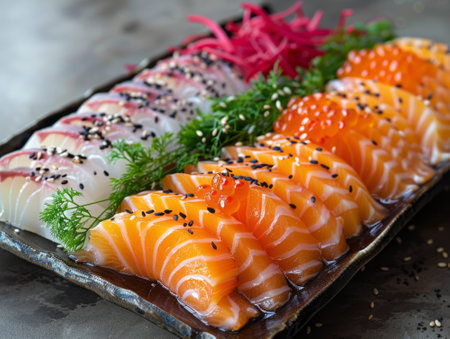 A beautifully arranged platter of fresh raw fish sashimi, showcasing vibrant colors and artistic garnishes, perfect for gourmet dining experiences.