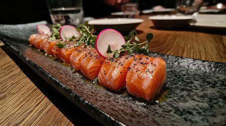 Beautifully presented fresh salmon slices garnished with radish on a sleek black plate, perfect for a gourmet dining experience or culinary showcase.