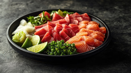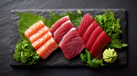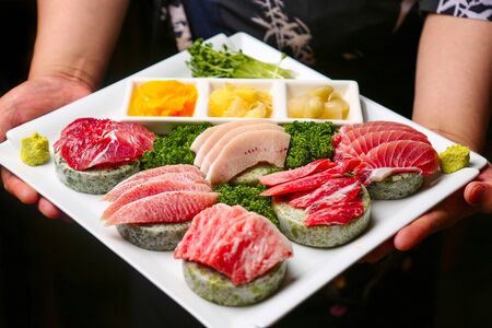 Delicious Japanese Sashimi dish on black plates. Osaka. Japan.