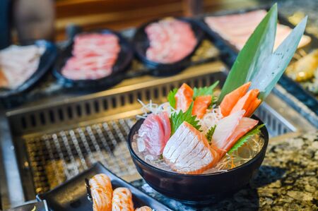 Close up of fresh set of raw sashimi fish on wooden board background