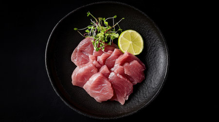 Tuna sashimi on a black background, selective focus.