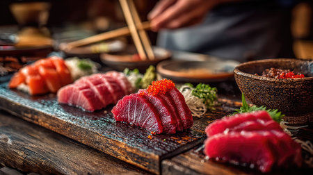 Taking tasty sashimi (pieces of fresh raw tuna) from black board, closeup