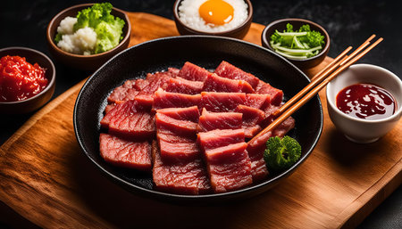 Premium wagyu beef meat served with egg yolk for cooking sukiyaki or yakiniku in Japanese restaurants.