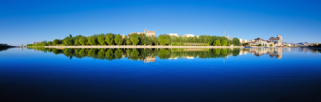 A city skyline is reflected in the water of a river. The sky is clear and blue, and the water is calm