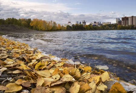 Autumn fallen leaves close-up on the lake, waves on the water, high houses under construction and trees on the horizon. Russia, Siberia, Novosibirsk, 2019