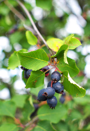 Red Amelanchier on tree branches in summer. Harvest in the garden