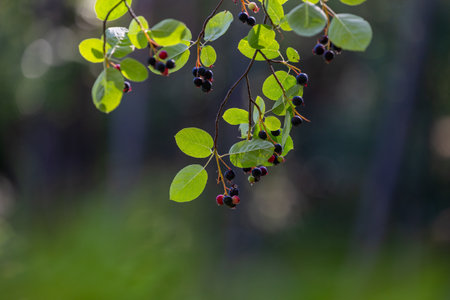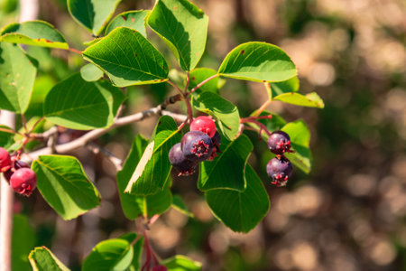 Beautiful saskatoon berries in the sunny forest. Dwarf serviceberry, shadbush, juneberry. Beautiful summer scenery of Latvia, Northern Europe.