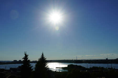 A beautiful blue sky with a river in the background. The sun is shining brightly, creating a peaceful and serene atmosphere