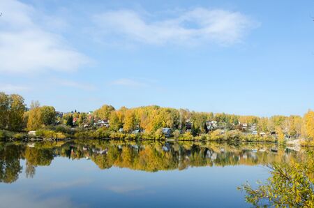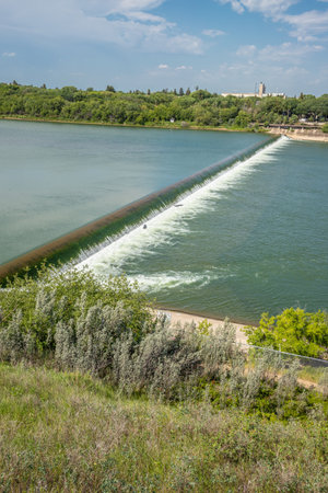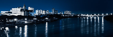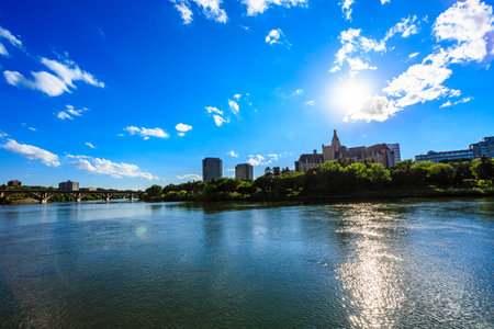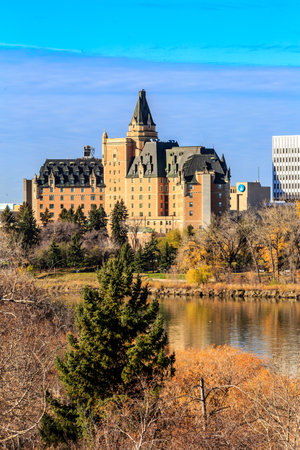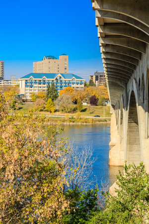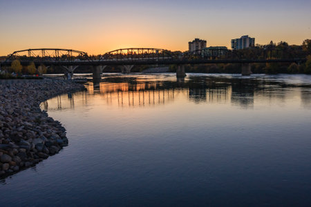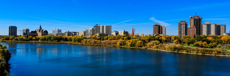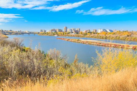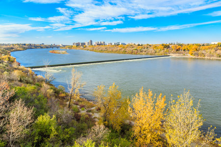 Calm waters of the South Saskatchewan River in Saskatoon, Canada in autumn.