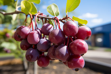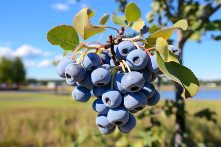 Saskatoon berry on a tree, photo realistic, 4K resolution , wide angle, AI generated