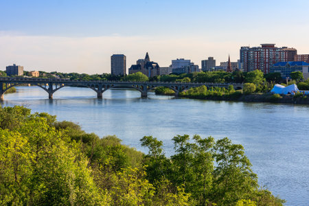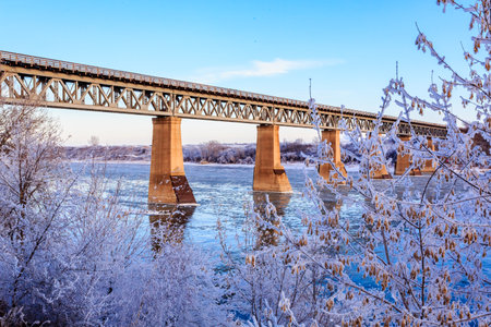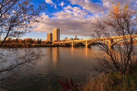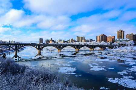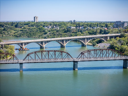 The city of Saskatoon, Saskatchewan, Canada. A morning view of the Victoria Bridge in early spring.