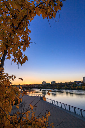 A beautiful sunset over a city with a river in the background. The sky is a deep blue color with a few clouds. The leaves on the trees are orange and yellow, creating a warm and inviting atmosphere