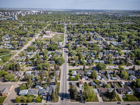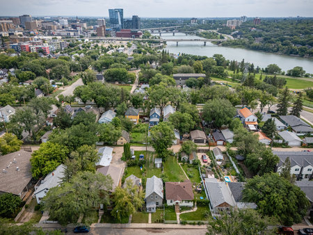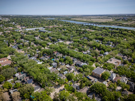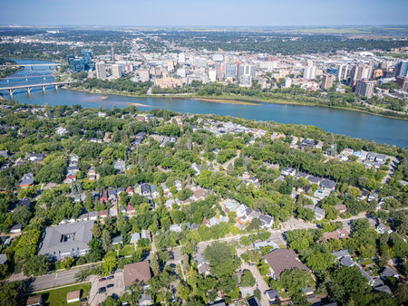 Aerial view of King George in Saskatoon, Saskatchewan, featuring homes, parks, and the South Saskatchewan River nearby.