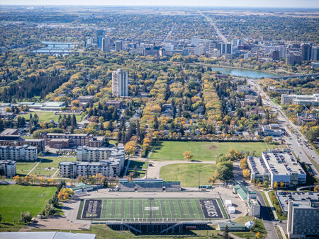 Aerial view of Meewasin Valley in Saskatoon, Saskatchewan, with colorful fall trees along the South Saskatchewan River.