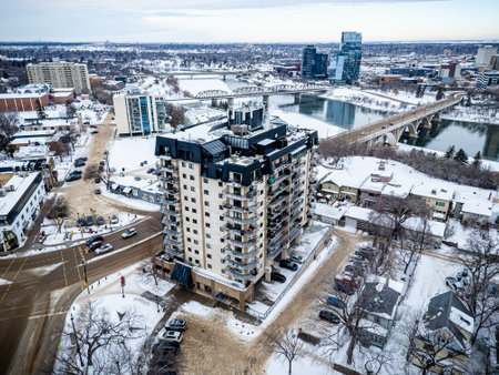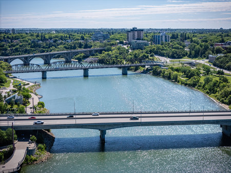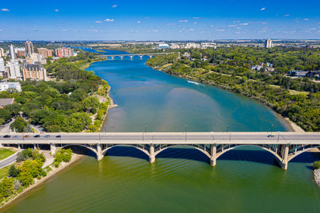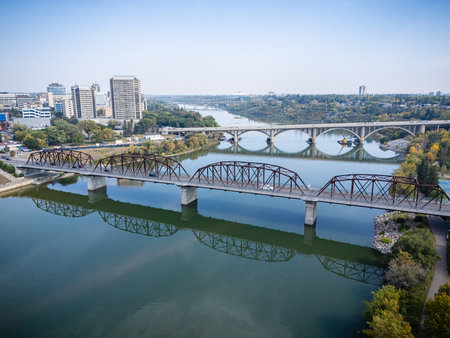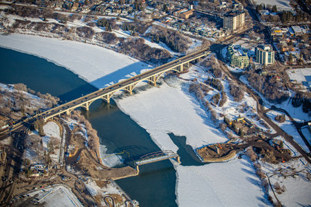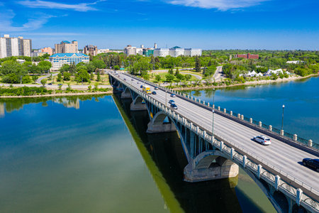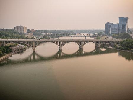 Aerial view of the Broadway and Traffic Bridges crossing the South Saskatchewan River in Saskatoon.