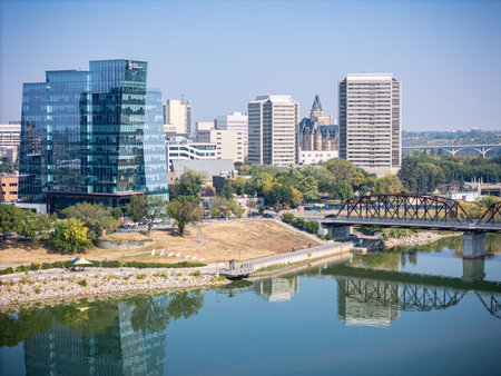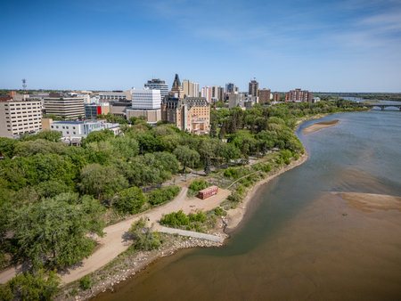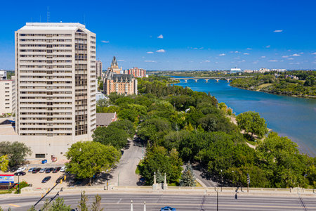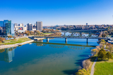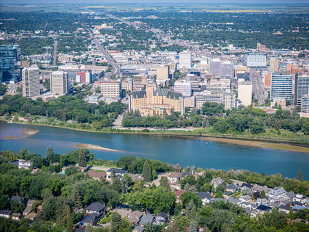 Aerial daytime view of downtown Saskatoon, Saskatchewan, featuring the city skyline, river, and bridges.