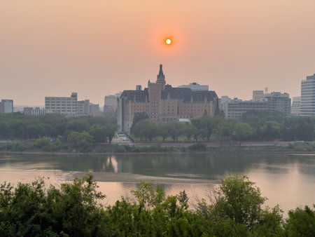 Aerial view of downtown Saskatoon, Saskatchewan, with wildfire smoke hazing the skyline and river valley.