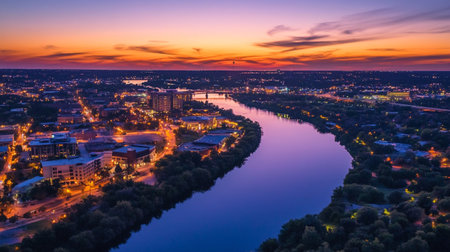 A city skyline is lit up at night, with the river reflecting the lights. Scene is serene and peaceful, as the city and river come together to create a beautiful scene