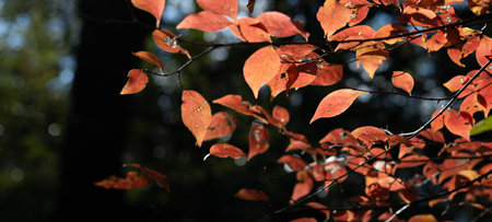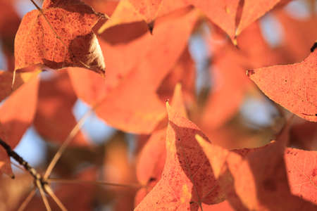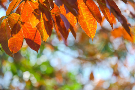 Leaves of Manchurian Maple or Acer mandshuricum in autumn against sunlight with bokeh background, selective focus, shallow DOF.