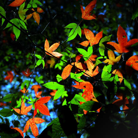 Leaves change colors from green to red and orange in tropical forest, vintage color
