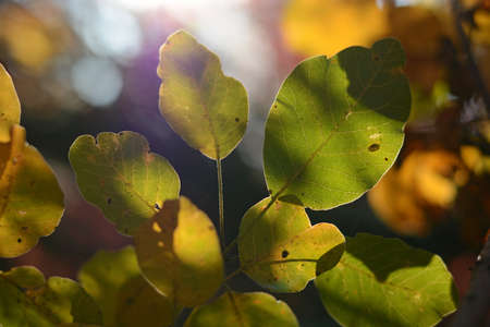 Autumn green yellow leaves blurred abstract colorful background at sunny day. Colors of autumn mood