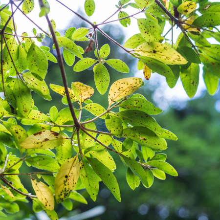 Autumn branch with yellowing leaves close up.