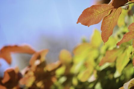 Close up of a different colored leaves in autumn. Blur orange bokeh background