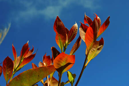 red almond leaves with blue sky