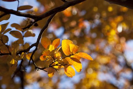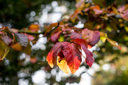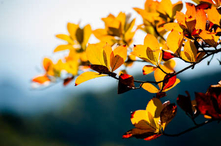 Colored leaves on tree branch, close up, soft selective focus. Mid autumn.