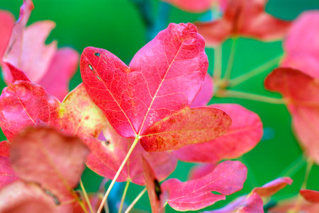 A macro shot of the multicoloured leaves of a smoke bush.