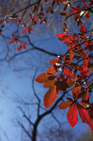 Branch of red leaves against the blue sky