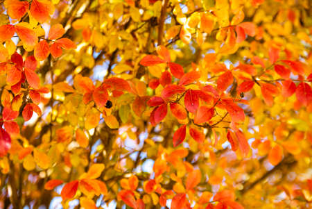 Autumn landscape. Yellow orange, red autumn leaves on a tree