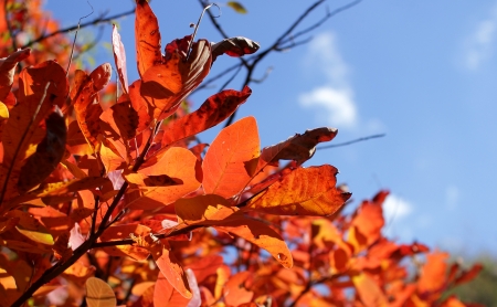 autumn leaves of red color and blue sky
